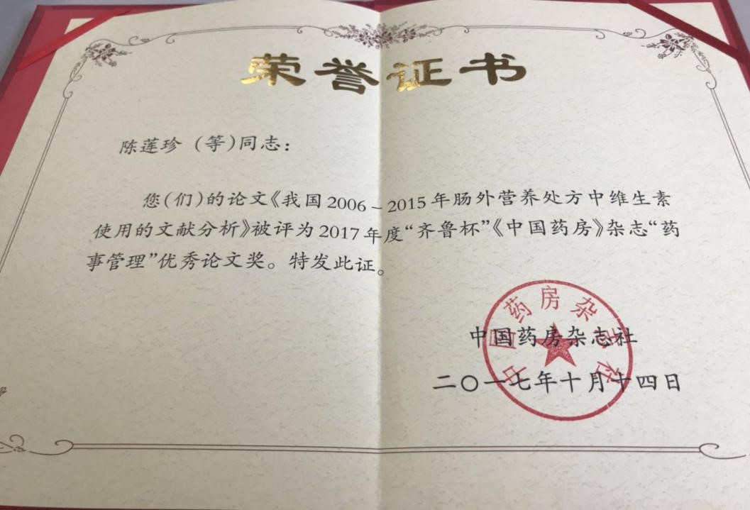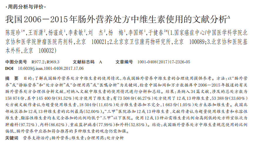 由中國醫(yī)學科學院腫瘤醫(yī)院陳蓮珍主任藥師執(zhí)筆,北京協(xié)和醫(yī)院基本外科于健春教授為通訊作者的學術(shù)論文——《我國2006-2015年腸外營養(yǎng)處方中維生素使用的文獻分析》發(fā)表在《中國藥房》雜志2017年第28卷第17期上。2017年10月14日,此文章被評為2017年度“齊魯杯”《中國藥房》雜志藥事管理優(yōu)秀論文獎。