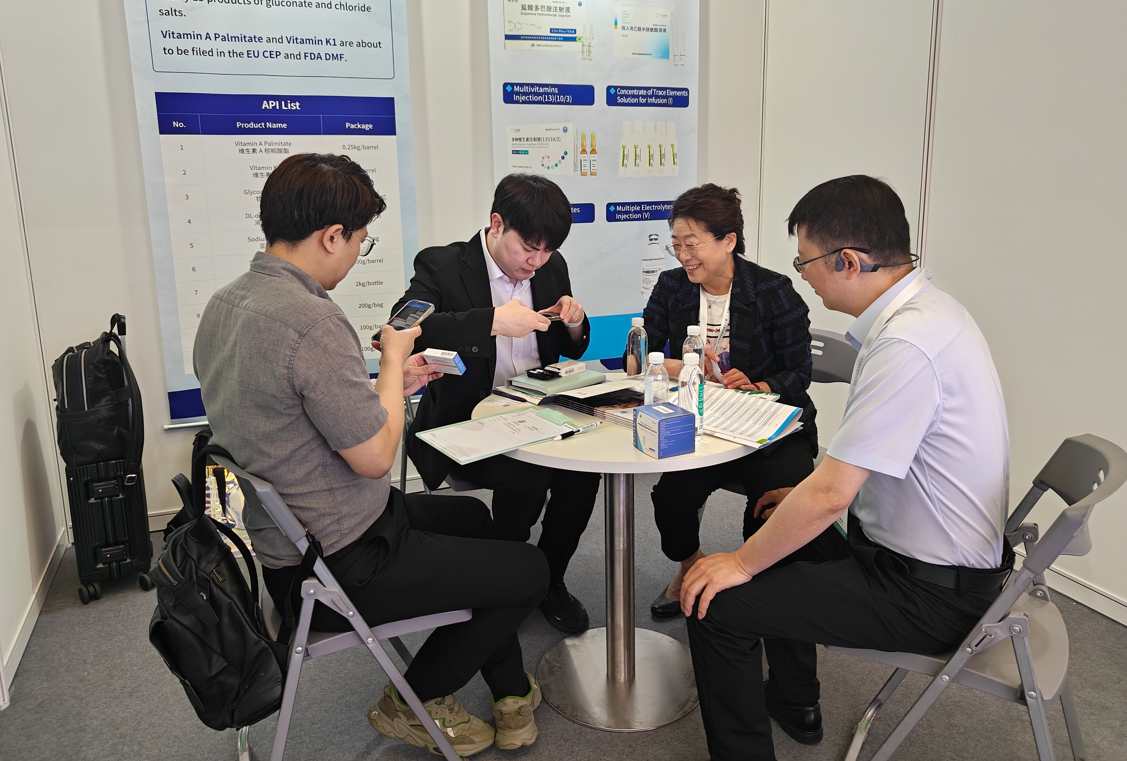 作為在腸外營(yíng)養(yǎng)領(lǐng)域致力于為全球合作伙伴提供原料、制劑產(chǎn)品及產(chǎn)能綜合解決方案的服務(wù)商,衛(wèi)信康攜微營(yíng)養(yǎng)素系列原料藥,以及公司重磅制劑:衛(wèi)優(yōu)佳??小兒多種維生素注射液(13)、衛(wèi)素齊??注射用多種維生素(13)(10/3)、依芬達(dá)??鹽酸多巴胺注射液、衛(wèi)苷檸??復(fù)方氨基酸注射液(20AA)等產(chǎn)品亮相本次展會(huì),全方位展示了公司在微營(yíng)養(yǎng)素領(lǐng)域的技術(shù)積淀與創(chuàng)新成果。與國(guó)際制藥巨頭、創(chuàng)新先鋒及活力新銳同場(chǎng)展示,彰顯了衛(wèi)信康的卓越實(shí)力和顯著競(jìng)爭(zhēng)力。公司核心產(chǎn)品整齊陳列,吸引了眾多新老客戶駐足觀看和咨詢,國(guó)際團(tuán)隊(duì)與來(lái)自歐美、印度、東南亞等全球各地客戶進(jìn)行了熱情且深入的商務(wù)洽談,現(xiàn)場(chǎng)人潮攢動(dòng),氣氛活躍。